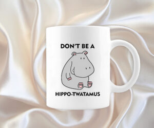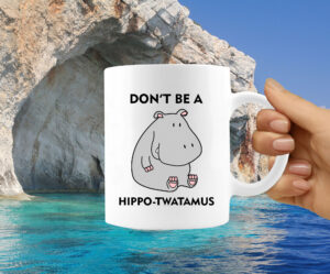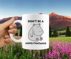 The Don’t Be a Hippo Twatamus Mugs is a frank and sassy way of saying “don’t be an enormous, unreasonable pain in the neck”.