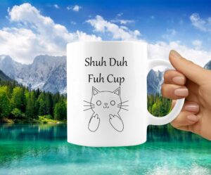 Have a Shuh Duh Fuh Cup Mug that says what you want instead. The Shuh Duh Fuh Cup is hand-designed in the US with a cute pouting cat with the words “shuh duh fuh cup” in high quality finishing meant to last long!